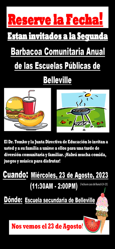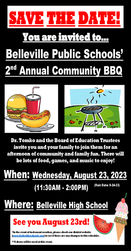 SAVE THE DATE! Belleville Public Schools will be holding a "Community BBQ" on August 23rd (11:30 am - 2:00 pm) on the BHS Campus. There will be lots of FREE food, music, and fun for everyone!
