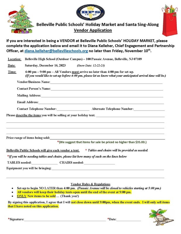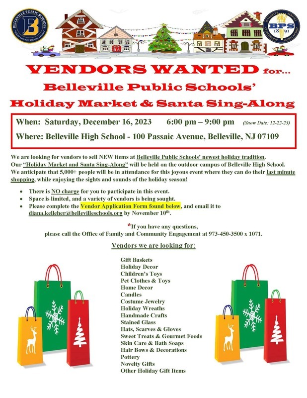 VENDORS Wanted for Belleville Public Schools' Holiday Market & Santa Sign-Along! Please see the attached flyer and VENDOR Application Form.
